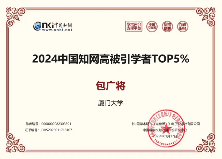 近日,中国知网下属的中国科学文献计量评价研究中心(简称“知网评价中心”)公布了2024年中国知网高被引学者预发布名单。我院教授吴崇伯入选中国知网高被引学者Top1%,副教授包广将入选中国知网高被引学者Top5%。
