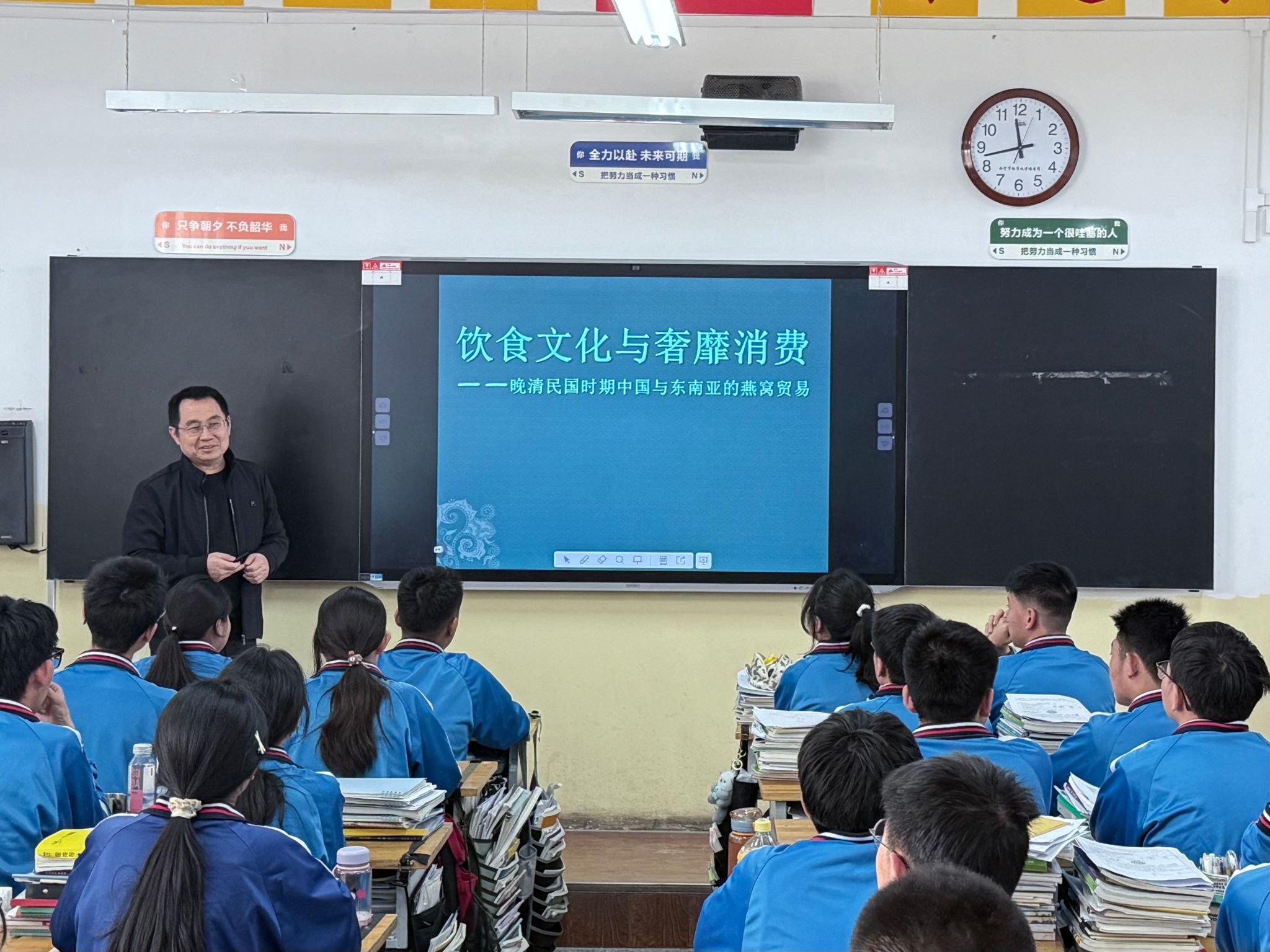 5月7日,宣传组首站走进西宁市第五中学。组长邱旺土书记通过鲜活生动的实例、精准详实的数据以及青海学子在厦大求学的精彩视频,全面展现了厦门大学在人才培养、科学研究、社会服务等方面的卓越成就。同时,他着重强调了学校涵养家国情怀、矢志创建世界一流大学的办学理念,充分彰显了厦大的办学特色,成功激发了在场学子对厦门大学的深切向往与报考热情。冯立军教授则凭借其深厚的学术造诣和独特的讲解风格,讲述了晚清民国时期中国与东南亚燕窝贸易背后的饮食文化与奢靡消费现象,让学生认识到饮食文化背后的社会阶层差异和消费观念,培养他们对历史文化和经济现象的分析与思考能力。