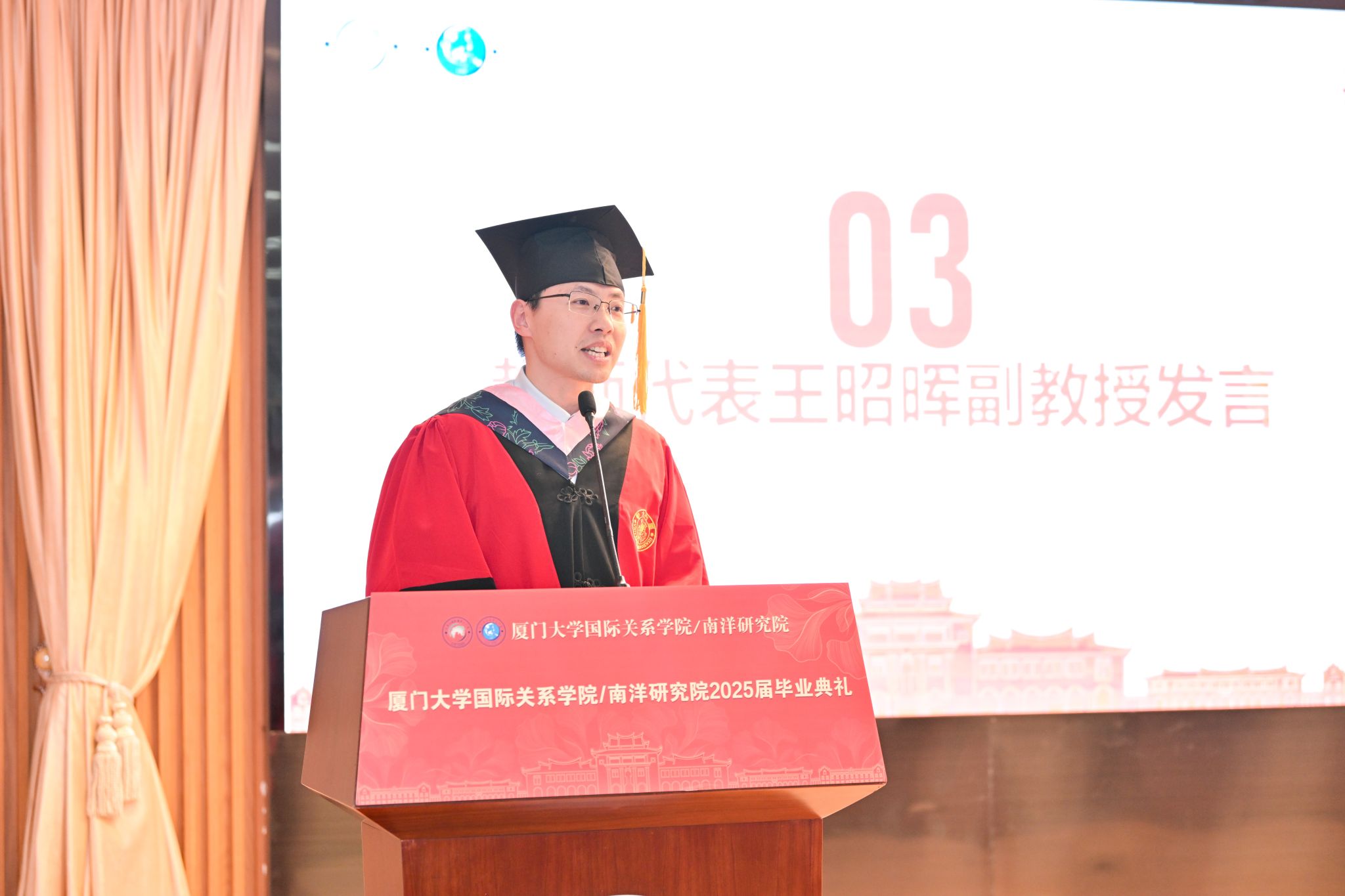 2025年6月20日下午,厦门大学国际关系学院/南洋研究院2025届毕业典礼在科艺中心一楼多功能厅举行。学院党政领导、教职员工、2025届毕业生和家长代表齐聚一堂,共同见证这一美好时刻。毕业典礼由2025届毕业生林沁和高桢主持。