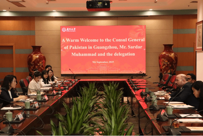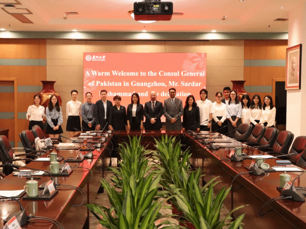 2025年9月9日上午,巴基斯坦驻广州总领事馆代表团与厦门大学国际关系学院/南洋研究院师生见面,双方就中国与巴基斯坦关系等议题进行座谈交流。我院副院长张淼副教授主持座谈,国际关系系副主任王昭晖副教授、隋雪濛助理教授及学生代表共同参与交流。巴基斯坦驻广州总领事馆代表团由总领事Sardar Muhammad率领,随行成员包括商务参赞Muhammad Imran、商务处投资官邓开来和总领事秘书赖桂珍。厦门市外事翻译护照签证中心副主任王岚一同出席。