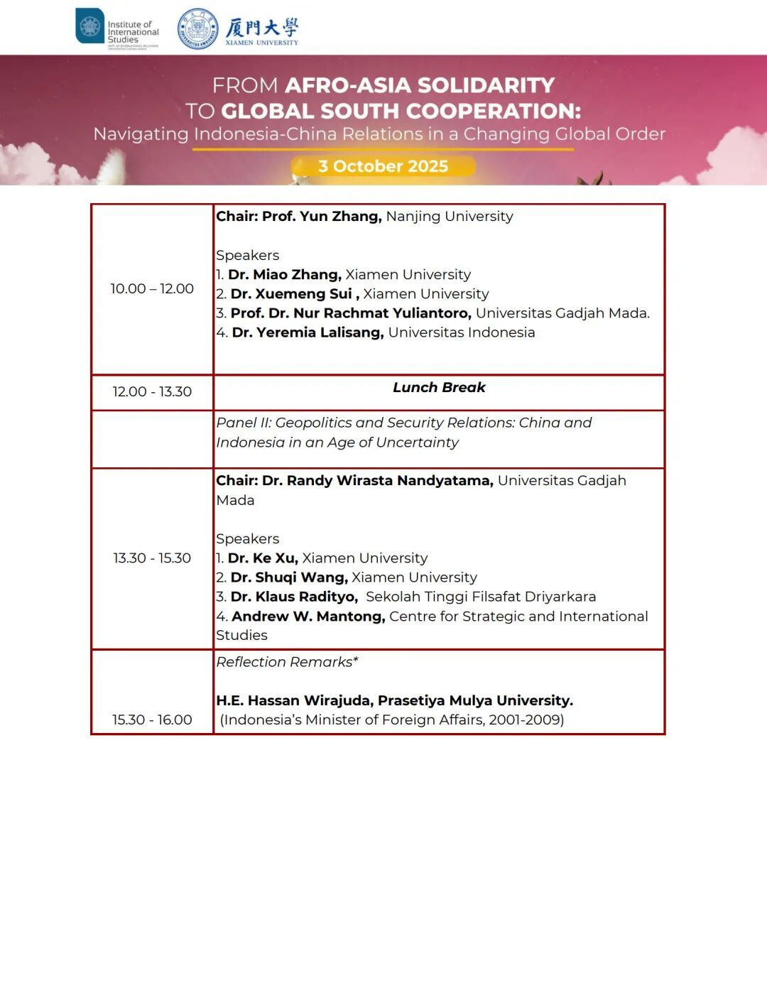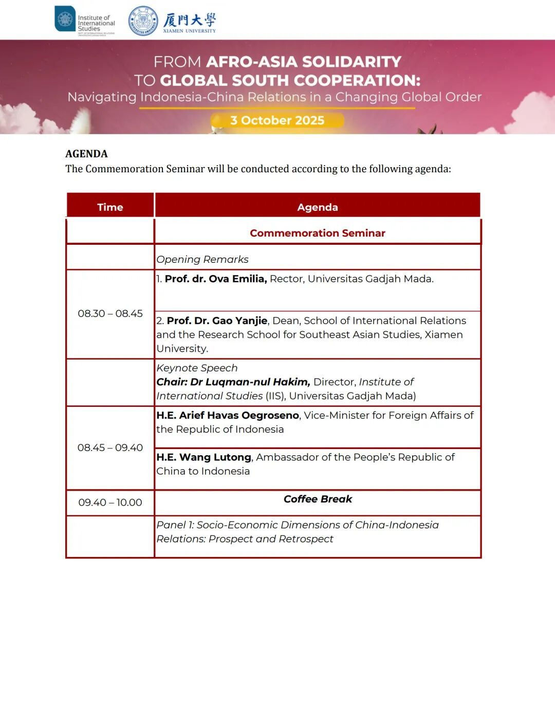 2025年10月3日,为纪念中华人民共和国与印度尼西亚共和国建交75周年,厦门大学国际关系学院/南洋研究院与印度尼西亚加查马达大学社会与政治科学学院将联合举办“中印尼关系:回顾与前瞻”高级别学术研讨会。本次研讨会在印尼日惹举行,主题为“从亚非团结到全球南方合作:变革全球秩序中的中印尼关系”,旨在深入梳理两国自上世纪50年代以来从后殖民团结走向全面战略伙伴关系的发展历程,聚焦新形势下双边合作面临的机遇与挑战,并为未来三十年两国关系的健康发展提供学术支持和政策参考。中国驻印尼特命全权大使王鲁彤、印尼外交部副部长阿里夫·哈瓦斯将出席研讨会并发表演讲。