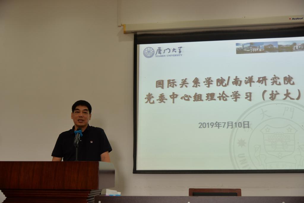 2019年7月10日下午,国际关系学院/南洋研究院在南安楼316会议室召开党委中心组理论学习(扩大),会议由国际关系学院/南洋研究院党委书记张必华主持,国际关系学院/南洋研究院全体在职教职工、博士后参加了理论学习。