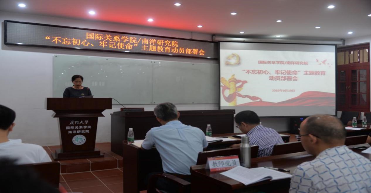 根据中共中央关于在全党开展“不忘初心、牢记使命”主题教育的意见,2019年9月19日下午,厦门大学国际关系学院/南洋研究院在南安楼101室召开了“不忘初心、牢记使命”主题教育动员部署会。