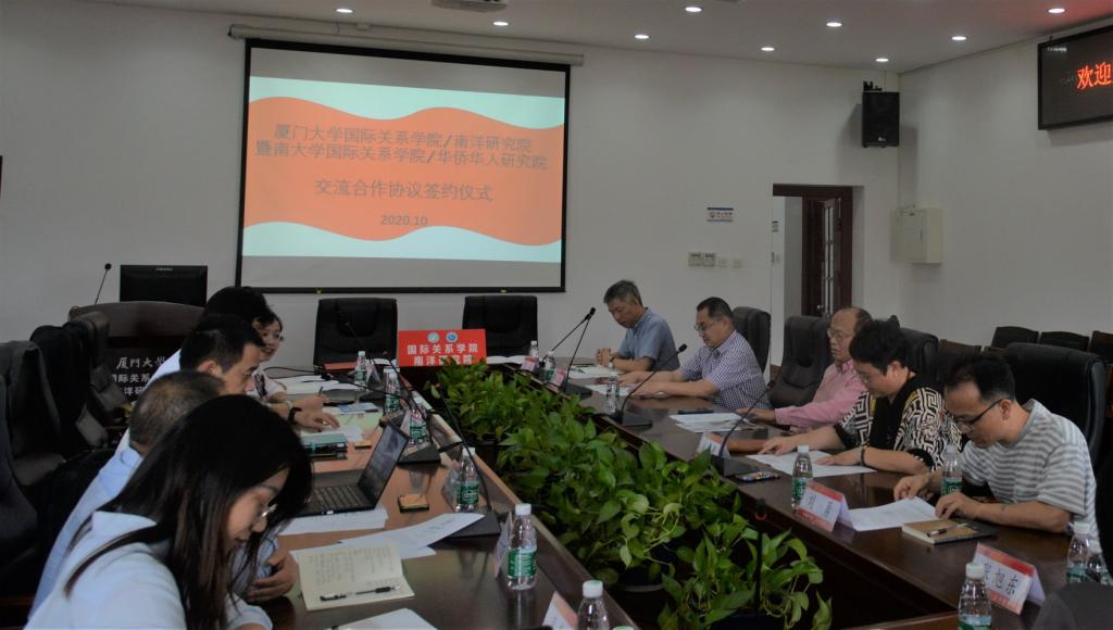 正式座谈开始前,两个学院举行交流合作协议签约仪式。签约代表分别是,暨南大学国际关系学院/华侨华人研究院党委书记谢煊,厦门大学国际关系学院院长李一平。