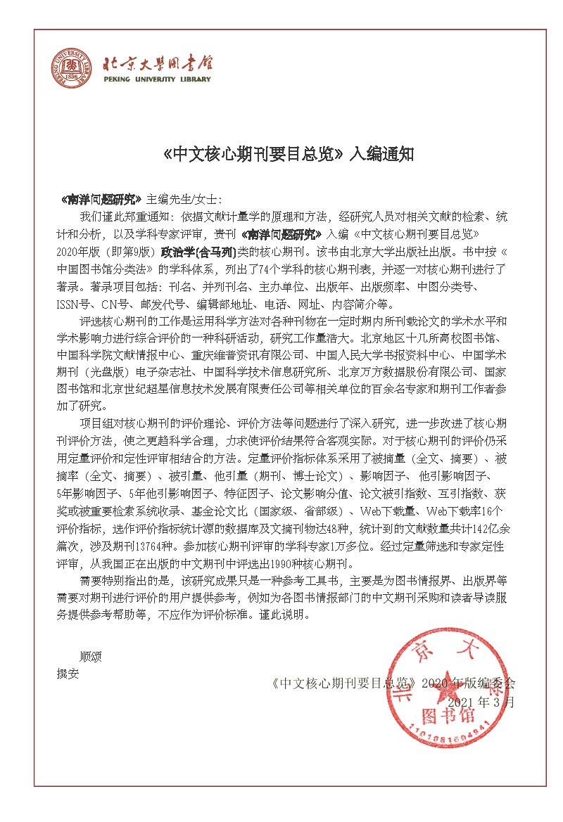 《南洋问题研究》入选《中文核心期刊要目总览》(2020年版)(“北大核心期刊”)