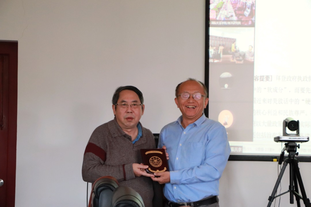 讲座伊始,李一平教授代表厦门大学国际关系学院/南洋研究院向时殷弘教授赠予南强学术讲座纪念牌,并向在场师生介绍时殷弘教授的学术贡献。本次讲座围绕时殷弘教授近期的一篇评论文章《拜登政府对华态势考察:侧重于战略军事》展开。