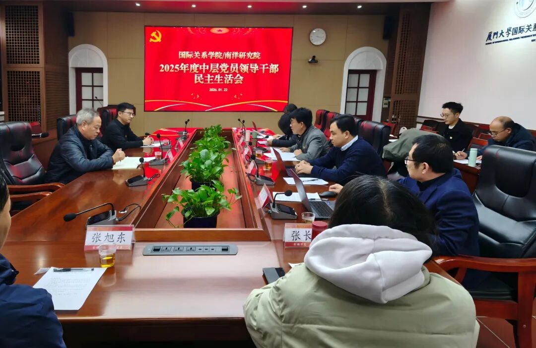 1月22日,国际关系学院/南洋研究院于南安楼301-3会议室召开2025年度中层党员领导干部民主生活会。校基层党建工作联络员谢银辉,校第三督导组副组长林明华到场指导。会议由国际关系学院/南洋研究院党委书记邱旺土主持。学院领导班子参加会议,学院党委委员、各系(中心)负责人代表、教工党支部书记代表,科级干部代表等列席会议。
