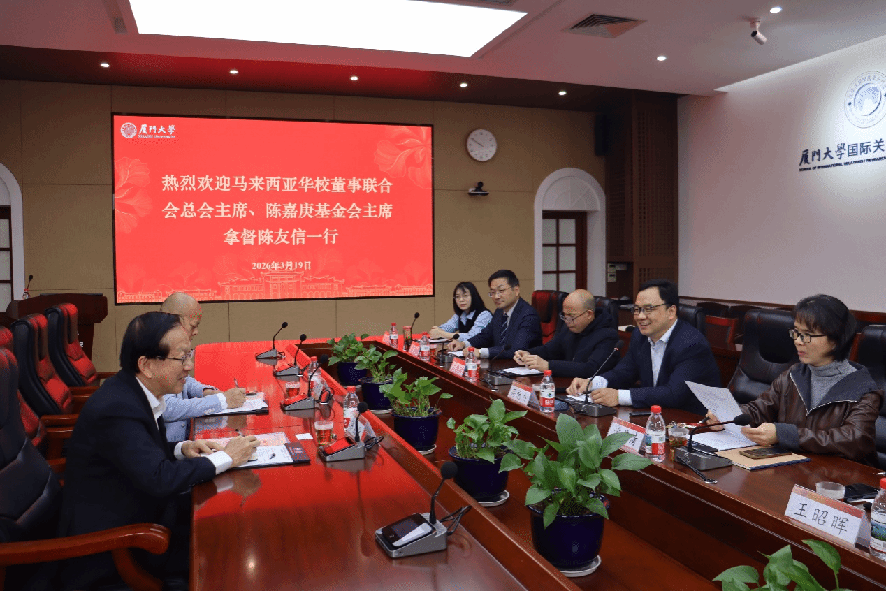 2026年3月19日上午,马来西亚华校董事联合会总会主席、陈嘉庚基金会主席陈友信、英迪教育集团福建省代表许艺宾来访我院,并与我院教师代表进行座谈交流。我院院长高艳杰教授主持本次座谈,副院长沈燕清教授、侨务与外交系副系主任王付兵副教授、国际关系系副系主任王昭晖教授,教师代表Danny Wong Tze Ken(黄子坚)讲座教授、刘计峰副教授、杨芳副教授、娄缃旖助理教授出席本次座谈会。