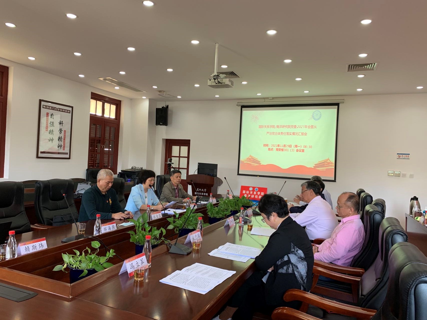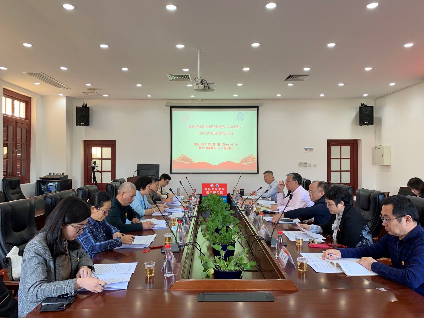 11月29日上午,校党委第五检查组到国际关系学院/南洋研究院开展全面从严治党主体责任落实情况检查。副校长、第五检查组组长邓朝晖,副组长郑建华以及组员林金宝、洪春生、邹海燕、赖斯炜(兼联络员)等参加检查工作。我院党委书记毛通文、院长李一平以及全体党政领导班子成员、党委委员、党支部书记代表参加会议。