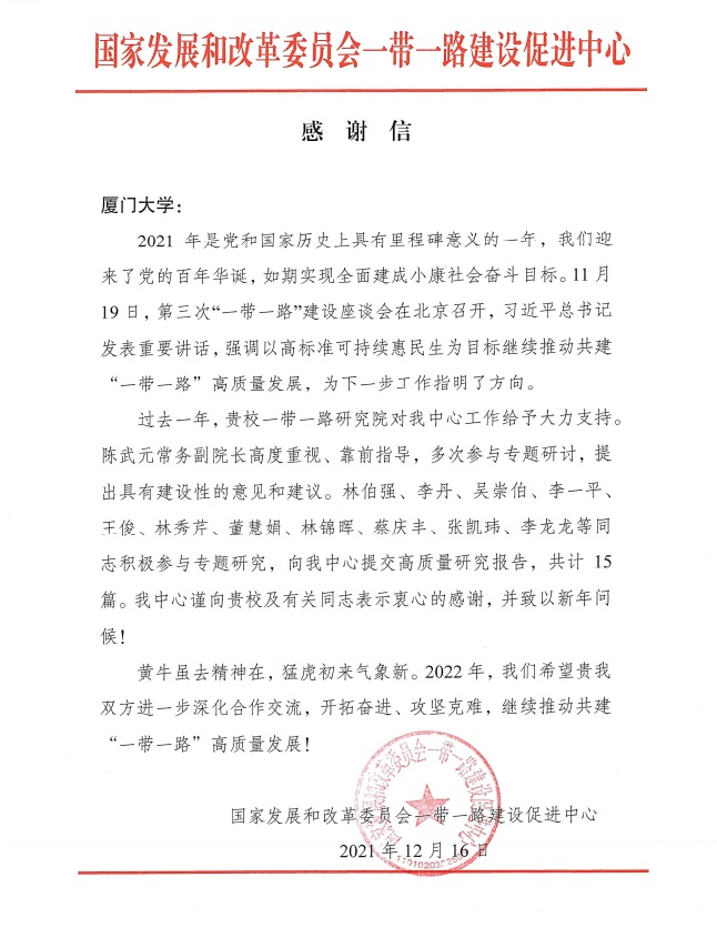 近日,国家发展和改革委员会“一带一路”建设促进中心向厦门大学发来一封感谢信,信中肯定了我院李一平教授、吴崇伯教授积极参与专题研讨,提交高质量研究报告等所做的工作。