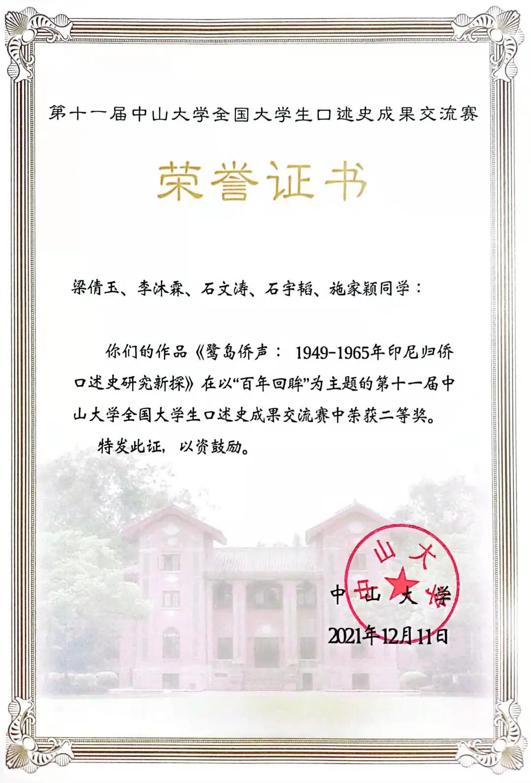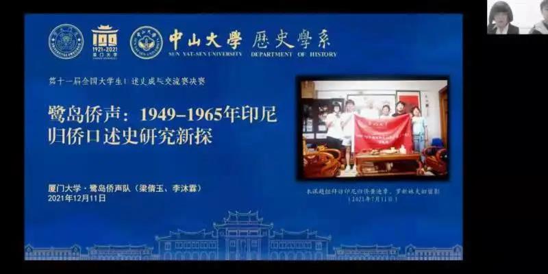 在第十一届全国大学生口述史成果交流赛中,厦门大学国际关系学院/南洋研究院学子梁倩玉团队的“鹭岛侨声”团队凭借“1949-1965年期间印尼归侨口述史研究”项目,从44支队伍中脱颖而出,入围决赛,最终荣获第十一届全国大学生口述史成果交流赛二等奖。