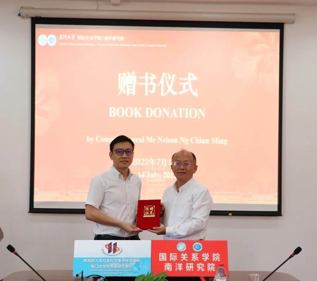 2022年7月14日,新加坡驻厦门总领事吴俊明(Nelson Ng Chiun Ming)一行来访我院并捐赠书籍40余册,书籍内容涵盖新加坡的政治、经济和文化等各个方面。李一平院长会见来宾。