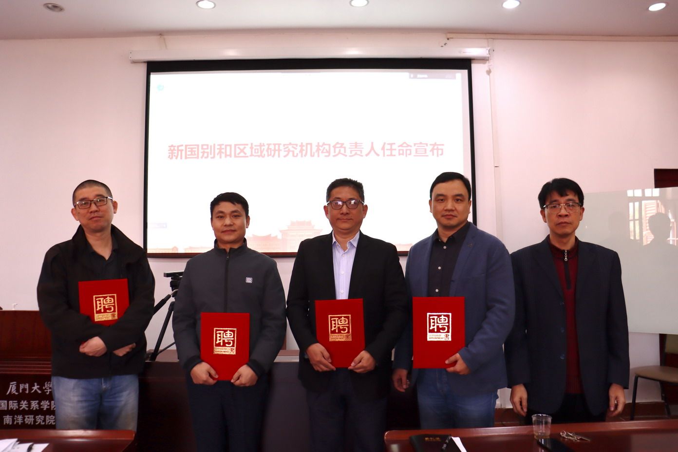 接着,邱旺土书记为新任命的教育部国别和区域研究机构的负责人颁发聘书。学院聘任高艳杰为教育部国别和区域研究(培育)基地—东盟研究中心主任;聘任林达丰为东盟研究中心副主任;聘任刘计峰为教育部国别和区域研究(备案)中心—马来西亚研究所主任;聘任包广将为教育部国别和区域研究(备案)中心—印度尼西亚研究中心主任;聘任许可为教育部国别和区域研究(备案)中心—新加坡研究中心主任。