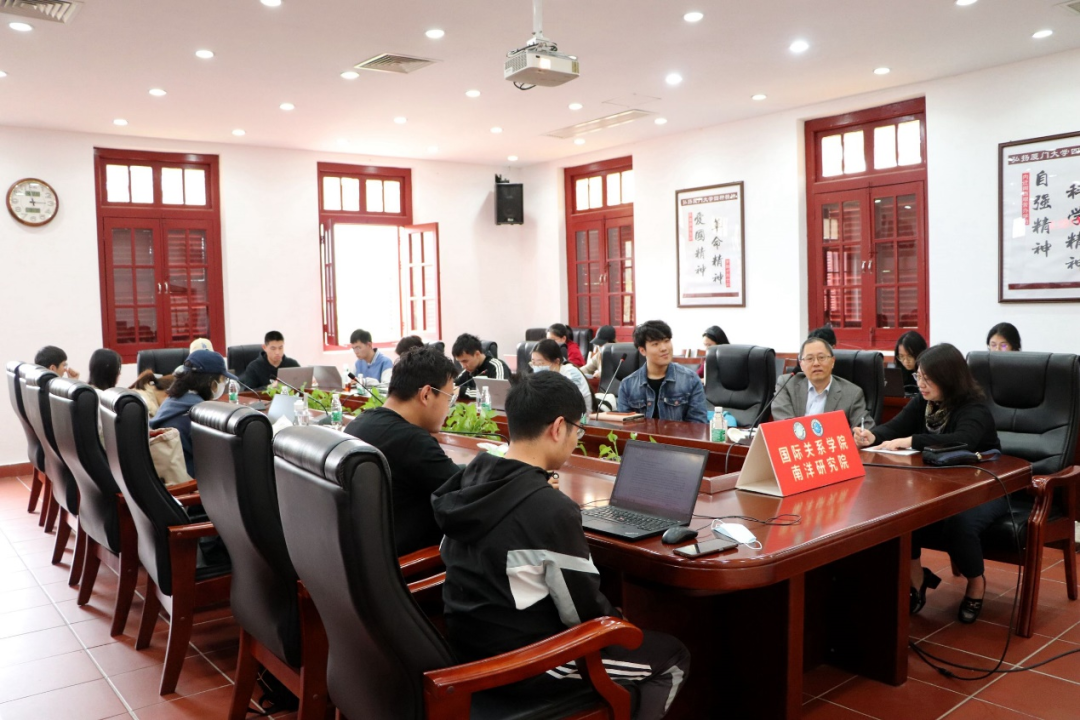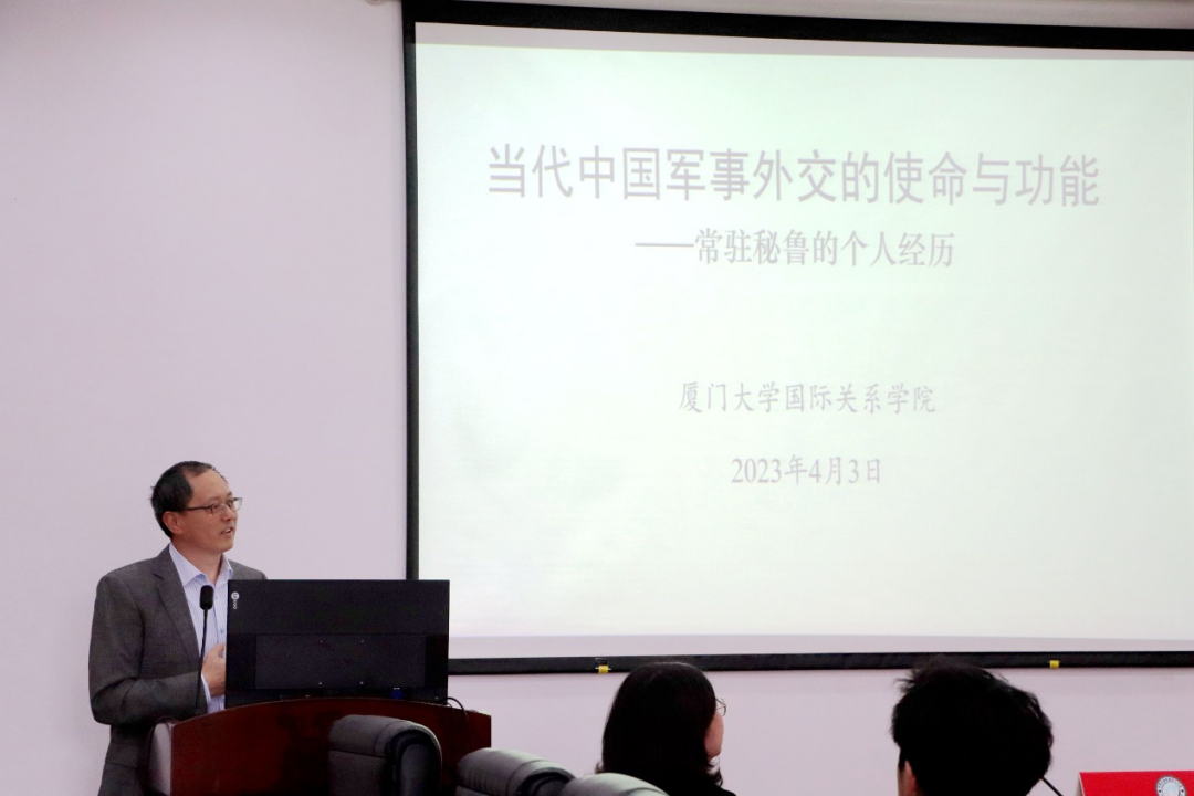 2023年4月3日下午,我院第一期学生习近平外交思想研修班“外事讲堂”系列讲座在厦门大学南安楼301-3会议室举行。本次讲座的题目是《当代中国军事外交的使命和功能:常驻秘鲁的个人经历》。主讲人为厦门大学国际关系学院/南洋研究院讲座教授周桂银教授。讲座由我院党委副书记何丽苹主持。