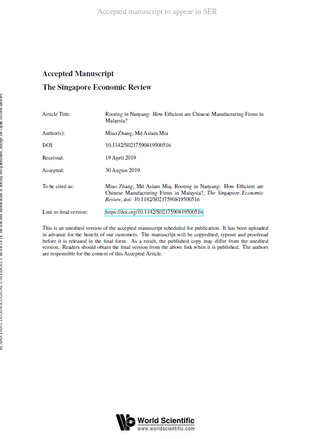 我所张淼老师在SSCI期刊《Singapore Economic Review》(《新加坡经济评论》)发表题为 《Rooting in Nanyang: How Efficient are Chinese Manufacturing Firms in Malaysia?》(《扎根南洋:在马来西亚的中资制造企业效率如何?》)论文。