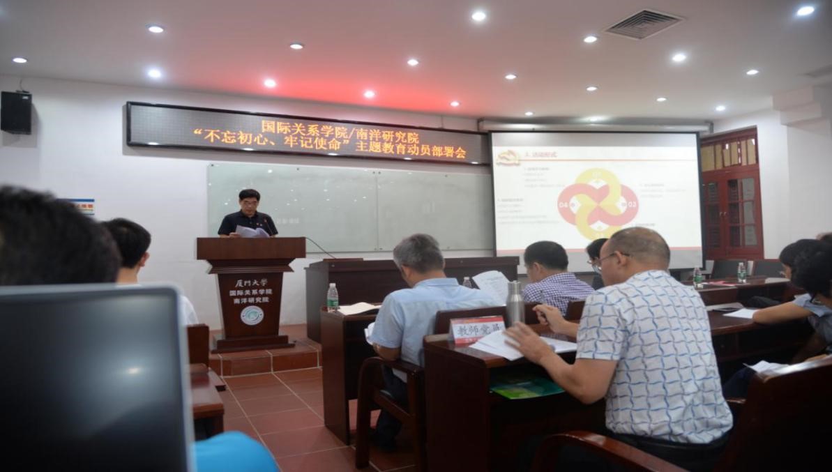 根据中共中央关于在全党开展“不忘初心、牢记使命”主题教育的意见,2019年9月19日下午,厦门大学国际关系学院/南洋研究院在南安楼101室召开了“不忘初心、牢记使命”主题教育动员部署会。