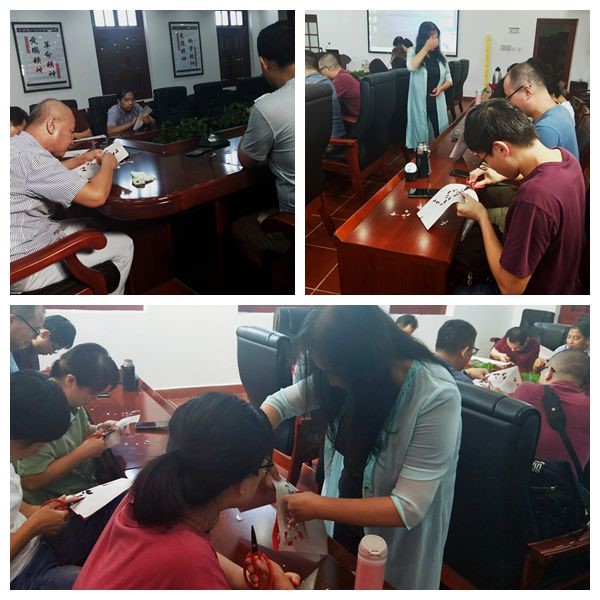 “剪纸,要从最复杂的开始剪起,先将内部的花纹剪完,再剪外面的轮廓,最后打开剪中间不对称的字。” 视频结束后,两位老师拿出了事先准备好的剪纸素材和剪刀,邀请在座各位老师亲手实践。
