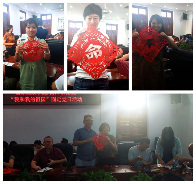 在老师们的不懈努力之下,剪纸作品终于完成,共同组成了“不忘初心、牢记使命”和庆祝中华人民共和国成立70周年的纹样。老师们举着自己的剪纸作品进行了合照,这次党日活动在大家的欢声笑语中结束了。