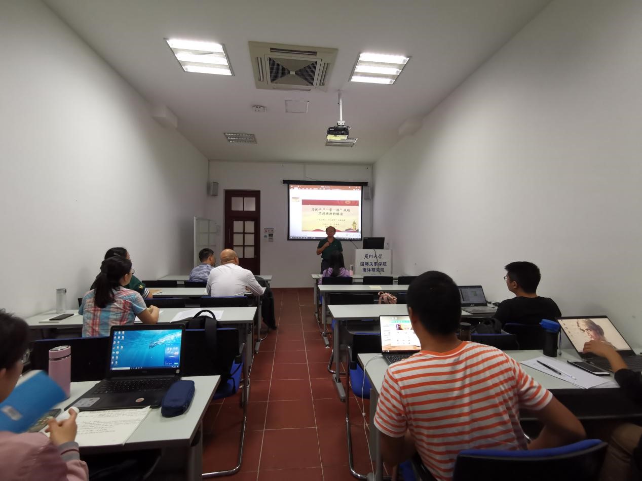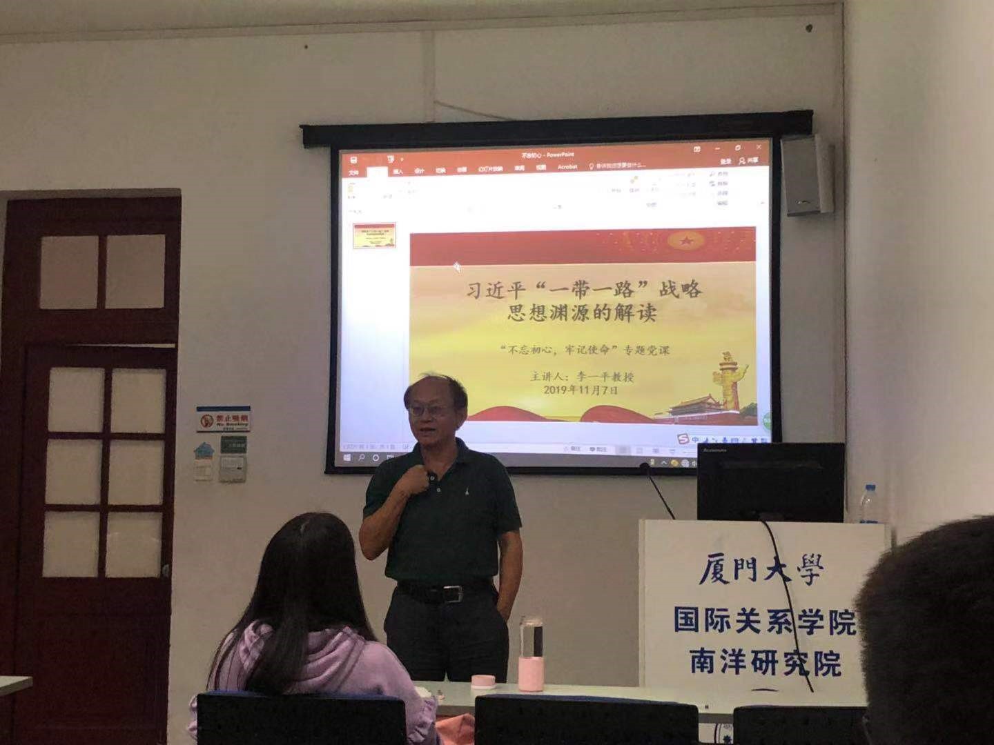 为深入推进“不忘初心、牢记使命”主题教育,进一步引导学生党员牢记初心使命,坚定理想信念,凝聚智慧力量。2019年11月7日晚7时,国际关系学院/南洋研究院院长、学院党委副书记李一平教授在南安楼105教室以“习近平‘一带一路’倡议思想渊源解读”为题为2019级博士生党支部成员讲授专题党课。