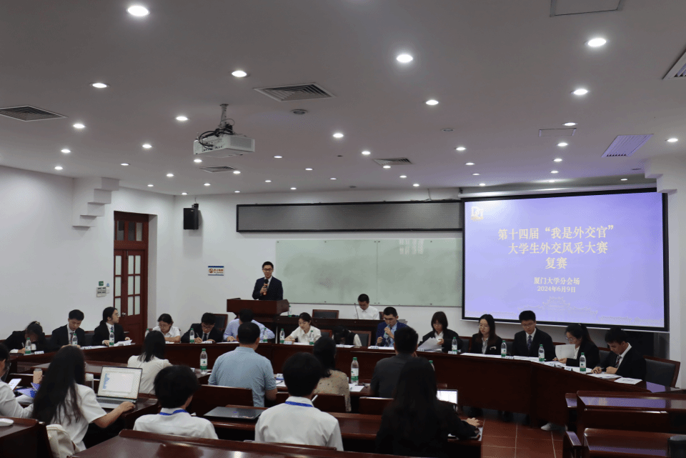 2024年6月9日,第十四届博睿杯“我是外交官”大学生外交风采展示大赛复赛在厦门大学南安楼101教室隆重举行。此次复赛,厦门大学国际关系学院/南洋研究院副教授张淼老师、包广将老师、张旭东老师担任评委,团委书记肖丽玮老师作为赛事嘉宾出席,见证了这场智慧与才华的激烈碰撞。