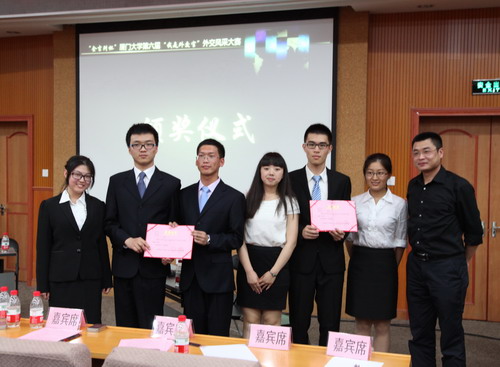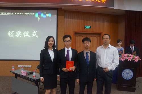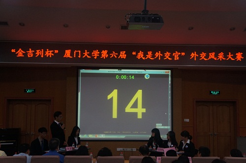 2014年4月18日晚7点,厦门大学第六届“我是外交官”外交风采大赛决赛暨闭幕式在厦门大学化学报告厅隆重举行。参加本次决赛暨闭幕式的有厦门大学校党委副书记林东伟、校团委书记陈怀锋、校学生处副处长宋友良、国际关系学院/南洋研究院党委书记范丽、党委副书记黄俊清等老师。国际关系学院/南洋研究院林梅、国际关系系主任赵海立、侨务与外交系主任王望波、国际关系系副主任张旭东四位老师担任了评委。活动吸引了近两百名师生到场观看。经过初赛、复赛层层选拔的四支队伍成功入围,最终由国际关系学院杜永佳、管理学院林寒如及人文学院马学丹组成的“VIEJO AMIGOS”队技压群雄,问鼎桂冠。