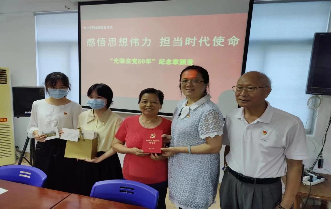 党课结束后,中山社区党委还举办了“50年党龄纪念章”颁发仪式,为老党员林幼美过“政治生日”,现场大学生代表为老党员送上精心自制的政治生日贺卡及、书籍,致敬老党员长达半个世纪艰苦奋斗、攻坚克难的长久岁月,激励大学生党员砥砺前行,为共产主义事业奋斗终身。