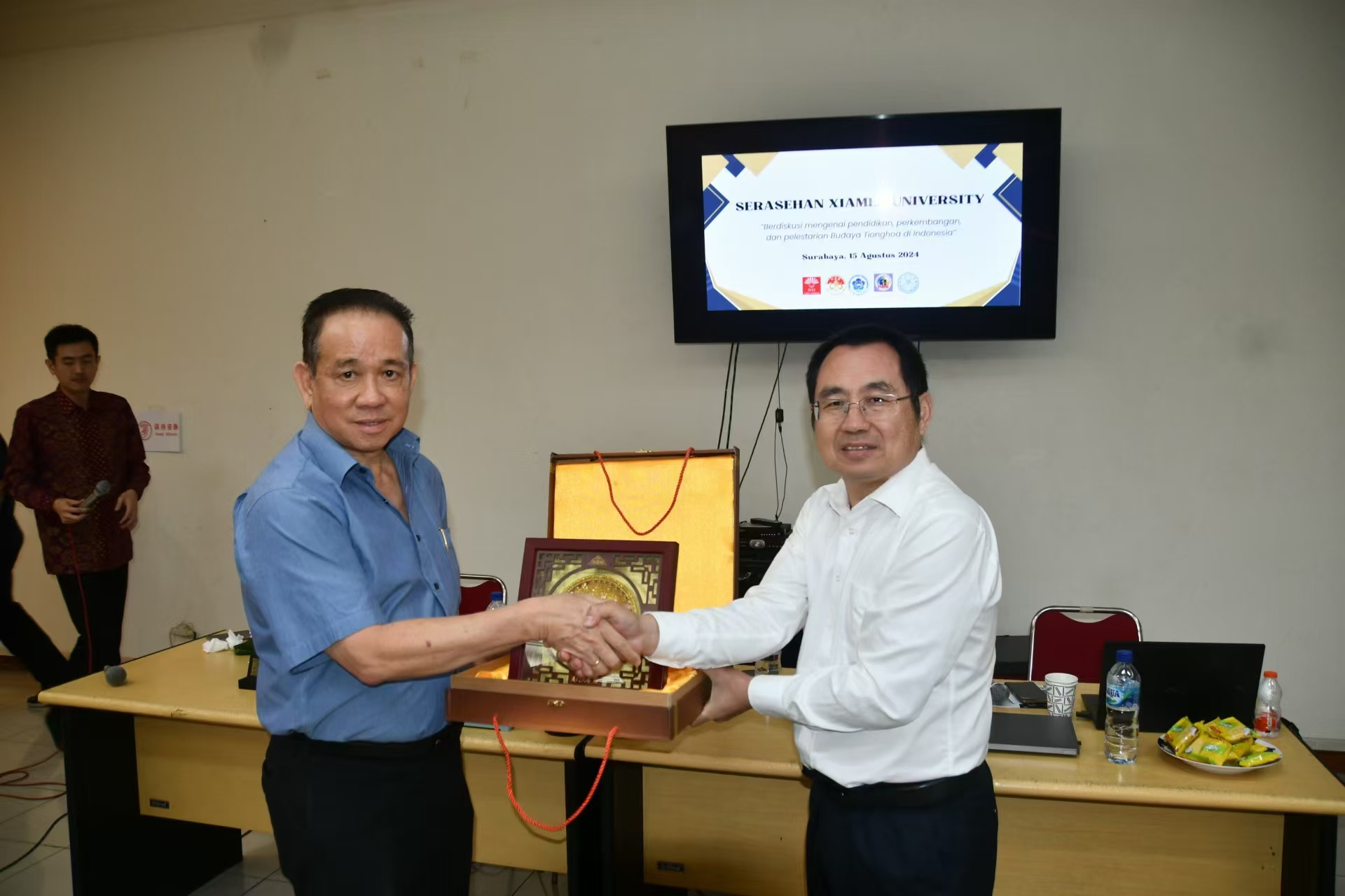 调研团在泗水参加了印尼华裔总会东爪哇分会(INTI Jatim)、联合印华百家姓协会东爪哇分会、泗水华裔联谊会、东爪哇江夏堂黄氏宗亲会等多个社团联合举办的座谈交流会,并与当地华侨华人社团、学校代表就“中华文化及教育在印尼的发展与保存”这一议题进行探讨。交流会分上下两部分:上半场交流会由王世圆讲师先向大家介绍厦门大学招生信息。接着,由冯立军教授介绍厦门大学国际关系学院/南洋研究院的来历与主要研究与培养方向。下半场交流会,由沈燕清教授介绍和分享“中华文化在印尼华人社会中的影响和存在”。通过此次交流会,调研团对印尼华侨华人对中华文化的认知和传承现状,以及对中华文化教育的迫切需求,感悟颇深,这为研究华侨华人与中国文化交流,以及双方的合作提供新的切入点。