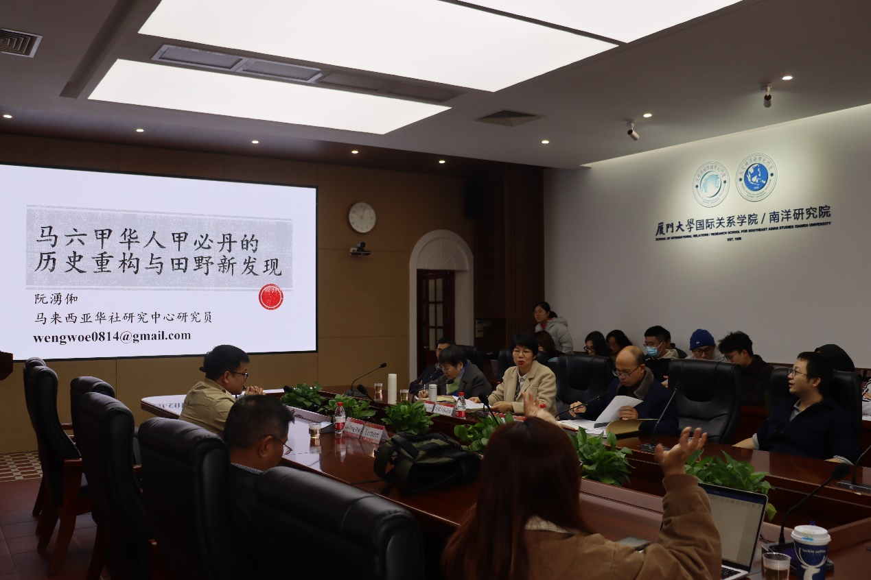 2024年12月18日上午,南洋问题与全球视野系列讲座第六十一讲、华侨华人与国际移民系列⑤在厦门大学南安楼301-3会议室举行。本次讲座特邀马来西亚华社研究中心研究员阮湧俰博士担任主讲人,主题为“马六甲华人甲必丹的历史重构与田野新发现”。阮湧俰博士研究方向与兴趣为马来西亚华人史、马来西亚国家历史档案、华人甲必丹、华人碾米业、华人族谱等。出版成果有《槟榔屿志略校注》(与聂德宁教授合作完成),目前主要负责执行马来西亚华社研究中心的旗舰项目—“雪隆华人方言帮群国家档案出版计划”的研究工作。