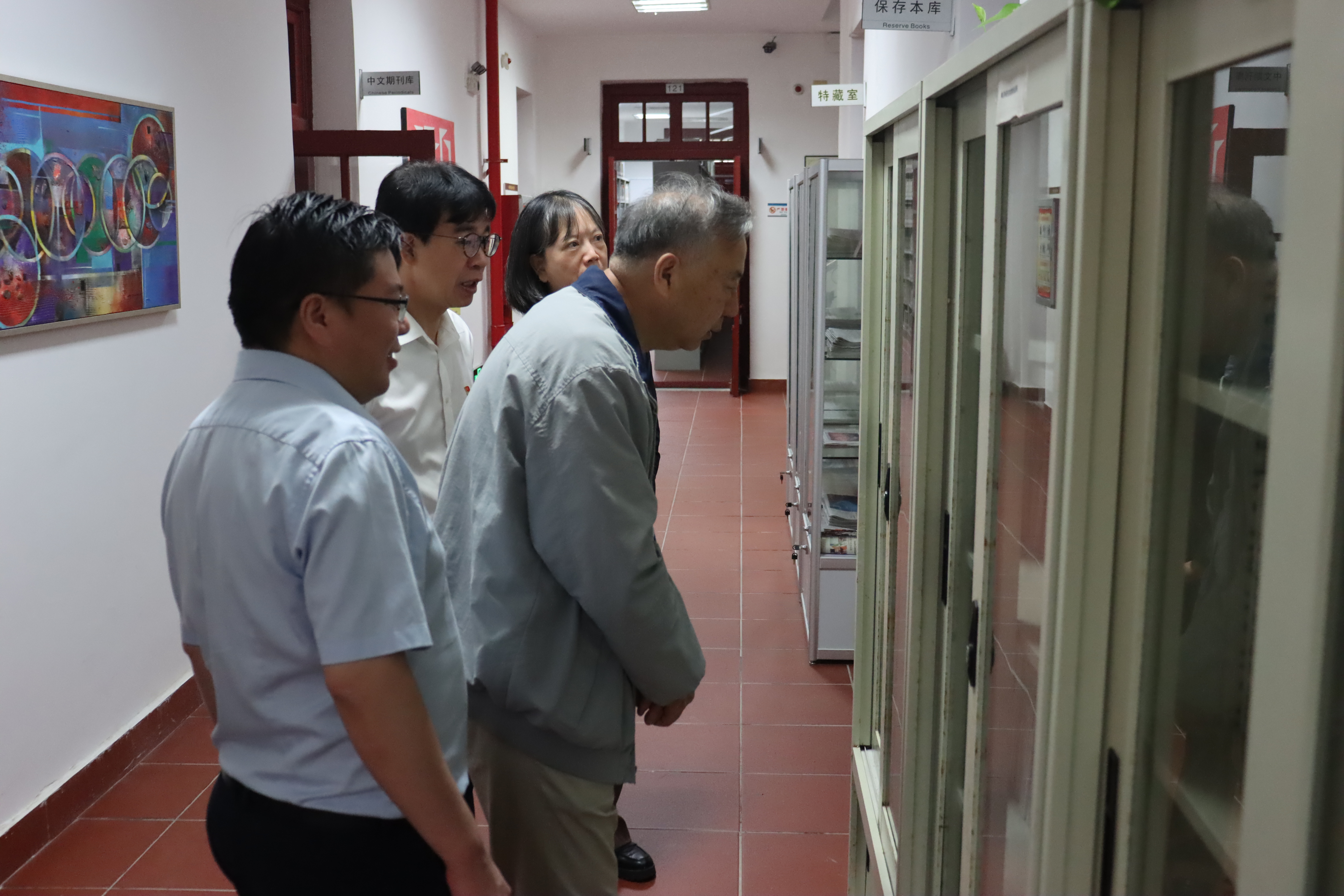 在调研座谈会之前,陈子辰、葛郝锐等一行参观了位于南安楼一楼的图书馆和三楼的学院展览室,对学院图书馆的馆藏情况、学院的发展历程、科研情况、学科特色等情况进行了实地调研,听取了里程碑事件、代表性科研成果、机构沿革等方面的介绍,了解了学院南洋研究和华侨华人研究特色。