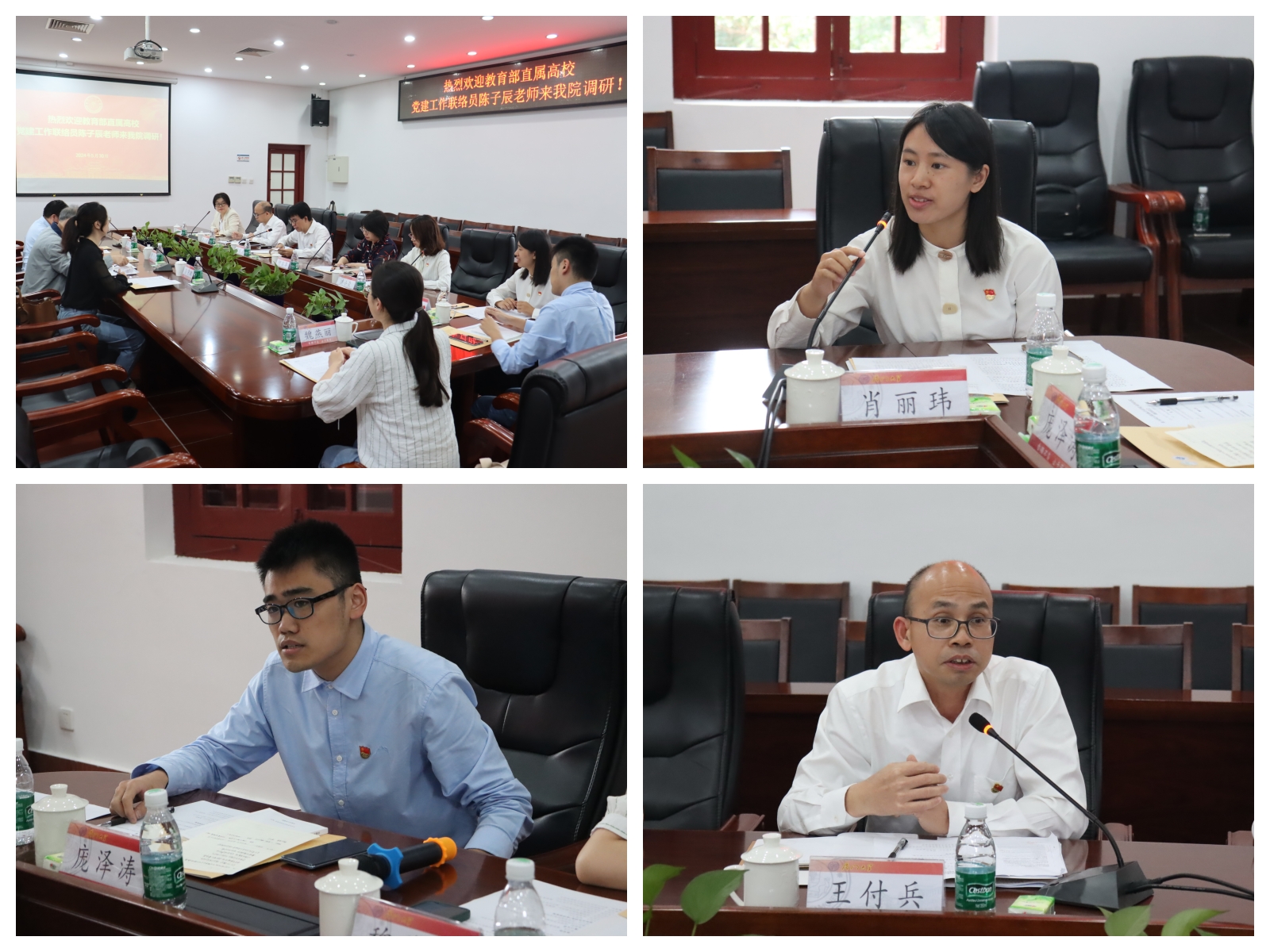 陈子辰与教师党支部书记王付兵,学生党支部书记肖丽玮、庞泽涛进行了交流,了解党支部党纪学习教育工作进展。