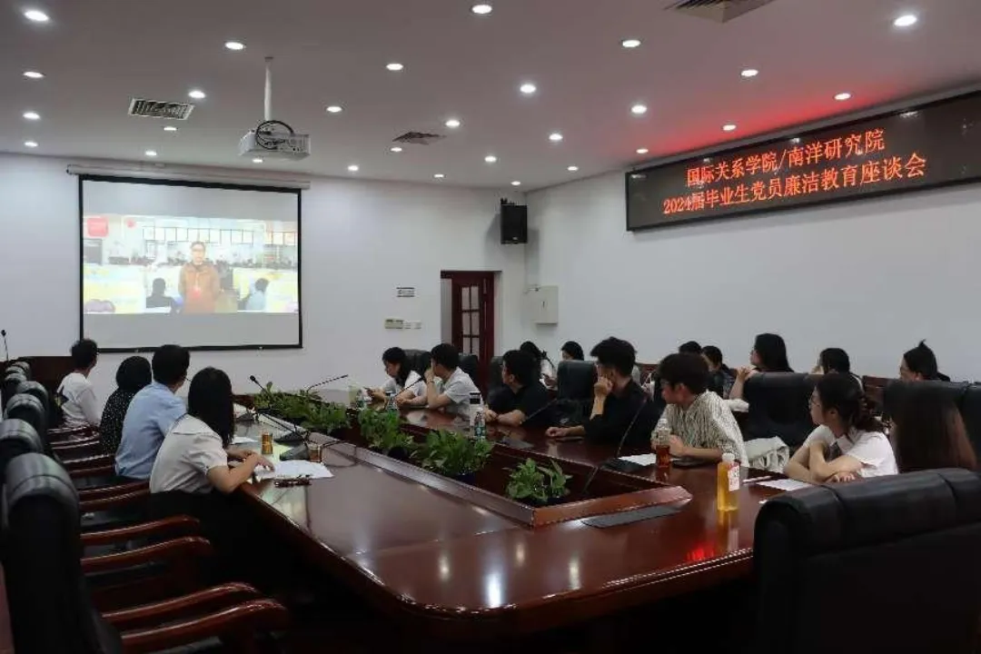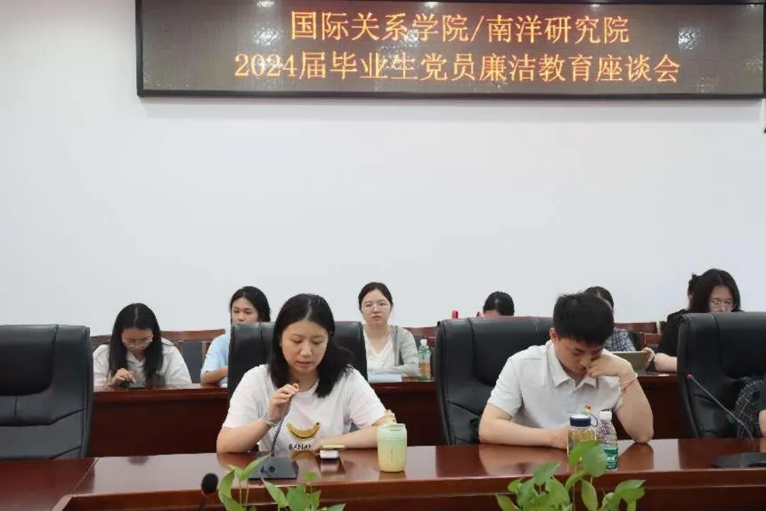 2024年6月13日下午3时,厦门大学国际关系学院/南洋研究院2024届毕业生党员廉洁教育座谈会在南安楼301-3室举行。学院党委书记邱旺土、党委副书记何丽苹、学院各党支部负责人以及2024届毕业生党员代表参加座谈会,院团委书记肖丽玮主持会议。