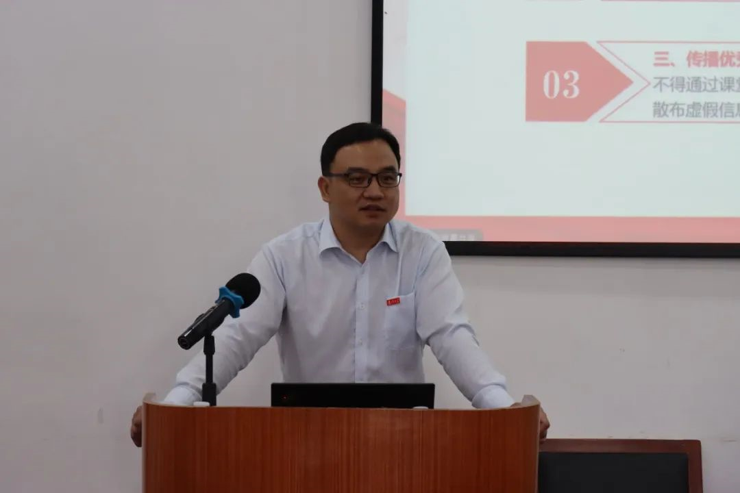 最后,邱旺土书记作总结讲话,他强调,师德师风建设永远在路上。全院教职工要结合正在开展的党纪学习教育,提高自身法治素养,以案为鉴,敲响警钟,及时学习相关制度,恪守底线意识,自觉规范职业行为,树立良好的师者形象。他表示,学院底蕴深厚,在前人的肩膀上,学院近期发展取得了显著的成绩,但是机遇与挑战并存,希望大家继续努力,服务“国之大者”,担当“国之重任”,积极为服务国家战略做出贡献。邱旺土书记还做了暑假安全提醒、保密安全教育和下学期工作部署。