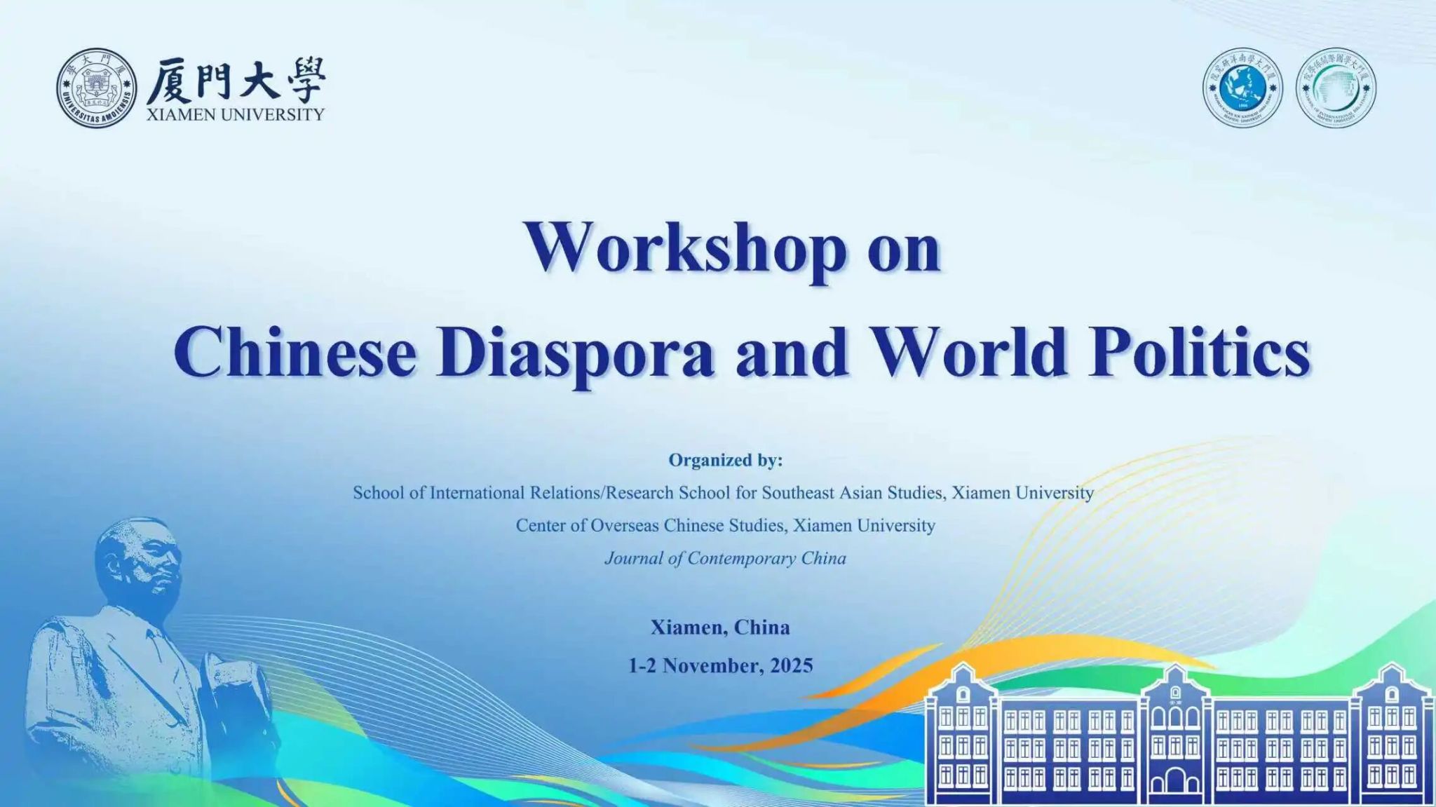 2025年10月31日至11月3日,由厦门大学国际关系学院/南洋研究院、厦门大学华侨华人研究中心与Journal of Contemporary China期刊联合主办的Workshop on Diaspora and World Politics——“华侨华人与世界政治”学术研讨会将在厦门大学举行。华侨华人是连接中国与世界的重要桥梁,是推动构建人类命运共同体的积极力量,本次论坛以“华侨华人与世界政治”为主题,以增进华侨华人如何与世界政治互动的理解为目标,聚焦华侨华人在全球的影响,围绕华侨华人在世界政治舞台上的重要作用、历史贡献与时代使命展开深入研讨,共同探索华侨华人与全球治理、文明互鉴、和平发展的紧密联系。