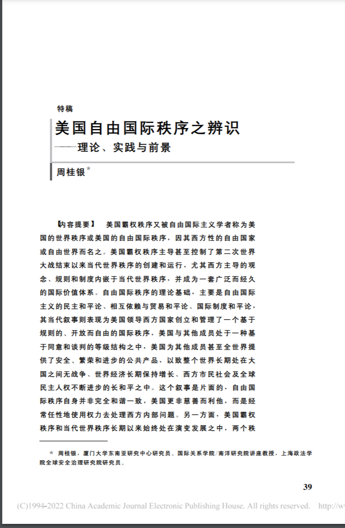 【科研动态】东盟研究中心周桂银老师发表论文《美国自由国际秩序之辨识——理论、实践与前景》
