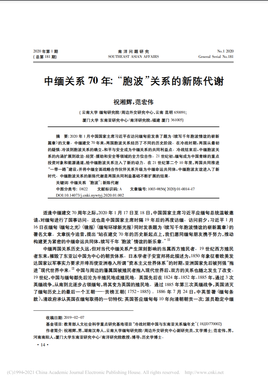 【科研动态】东盟研究中心范宏伟老师发表论文《中缅关系70年:“胞波”关系的新陈代谢》