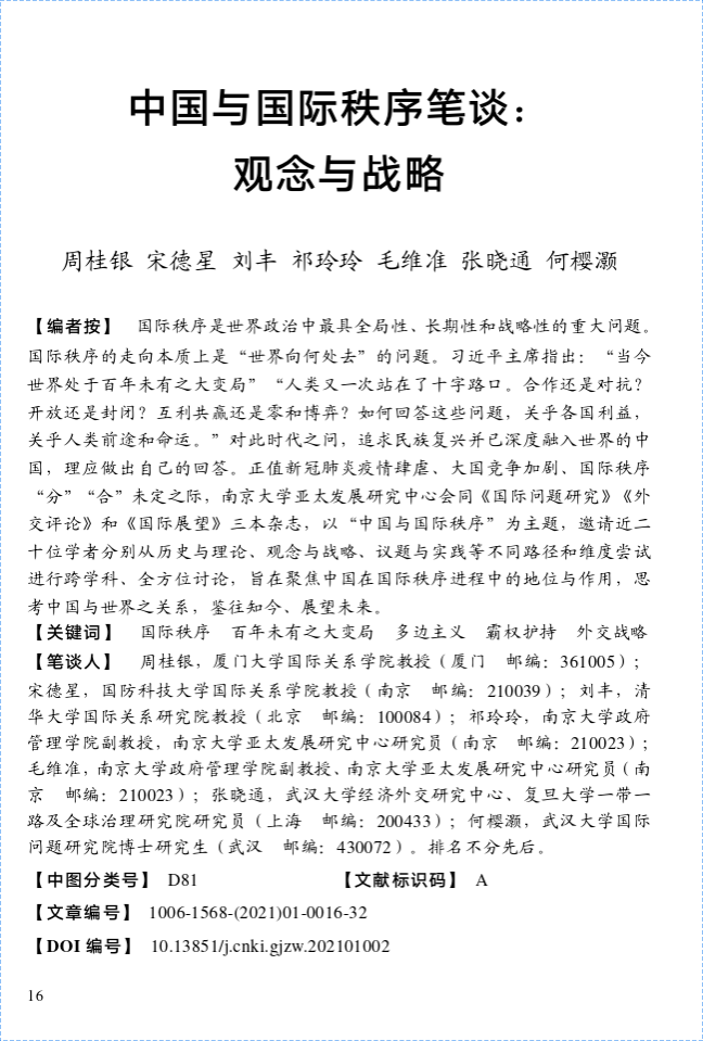 2021年1月,周桂银老师在CSSCI来源刊物《国际展望》上发表论文《中国与国际秩序笔谈:观念与战略》。文章指出,国际秩序是世界政治中最具全局性、长期性和战略性的重大问题。国际秩序的走向本质上是“世界向何处去”的问题。习近平主席指出:“当今世界处于百年未有之大变局”“人类又一次站在了十字路口。合作还是对抗? 开放还是封闭?互利共赢还是零和博弈?如何回答这些问题,关乎各国利益, 关乎人类前途和命运。”对此时代之问,追求民族复兴并已深度融入世界的中国,理应做出自己的回答。正值新冠肺炎疫情肆虐、大国竞争加剧、国际秩序 “分”“合”未定之际,南京大学亚太发展研究中心会同《国际问题研究》《外 交评论》和《国际展望》三本杂志,以“中国与国际秩序”为主题,邀请近二十位学者分别从历史与理论、观念与战略、议题与实践等不同路径和维度尝试 进行跨学科、全方位讨论,旨在聚焦中国在国际秩序进程中的地位与作用,思考中国与世界之关系,鉴往知今、展望未来。