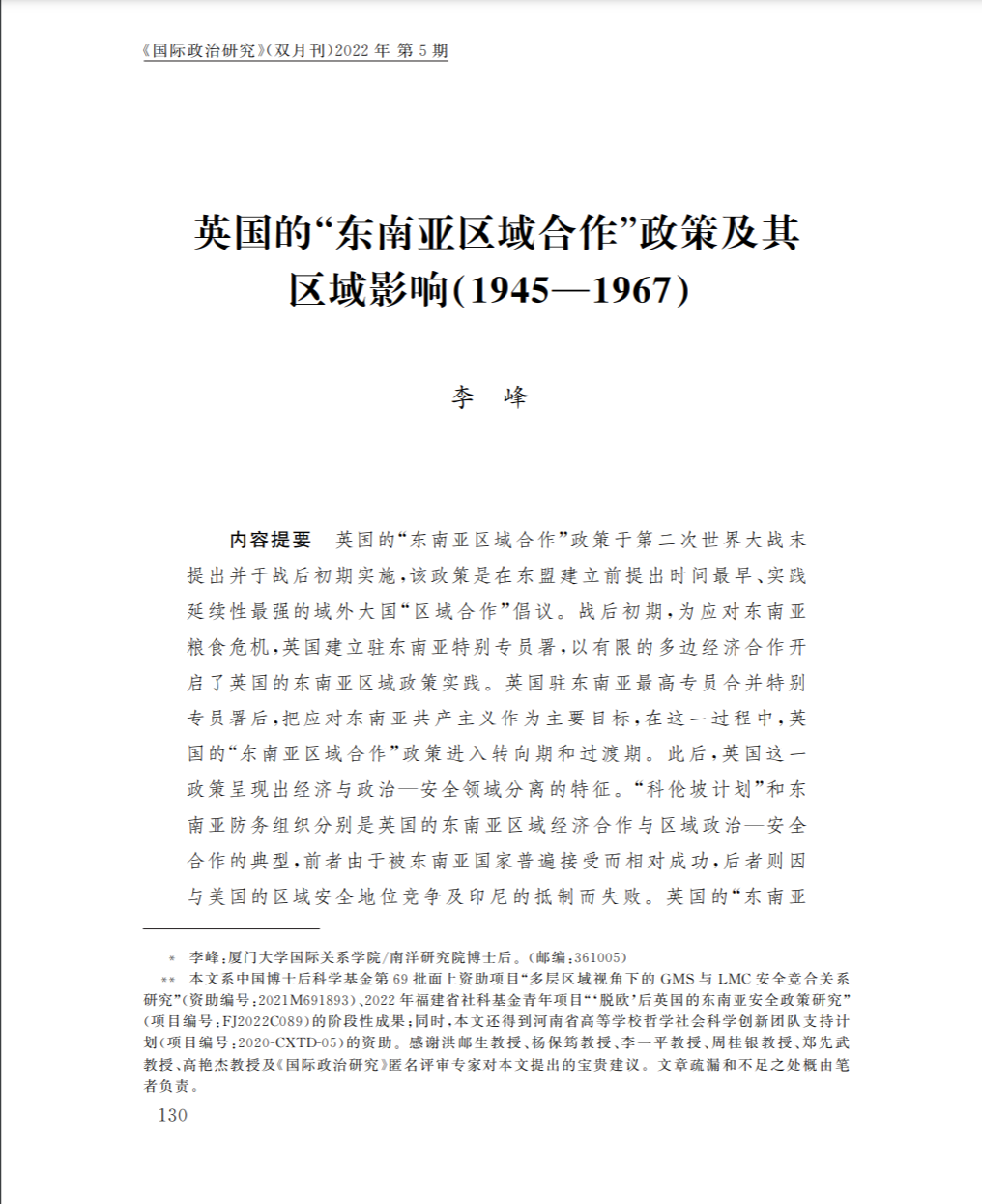 2022年11月20日,李峰老师在CSSCI来源刊物《国际政治研究》发表文章《英国的“东南亚区域合作”政策及其区域影响 (1945-1967) 》。文章指出英国的“东南亚区域合作”政策并非现代意义上的区域合作,但在区域规范建构、组织经验积累等方面,该政策对东南亚内生区域合作及东盟的诞生产生了影响。英国的“东南亚区域合作”政策于第二次世界大战末提出并于战后初期实施,该政策是在东盟建立前提出时间最早、实践延续性最强的域外大国“区域合作”倡议。战后初期,为应对东南亚粮食危机,英国建立驻东南亚特别专员署,以有限的多边经济合作开启了英国的东南亚区域政策实践。
