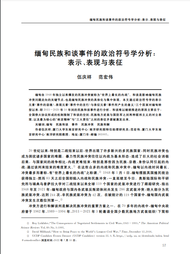 【科研动态】东盟研究中心Hein Khaing特任助理研究员发表论文《缅甸民族和谈事件的政治符号学分析》