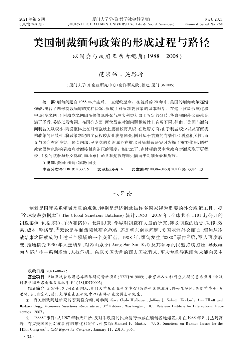 2021年11月,范宏伟老师在CSSCI来源刊物《厦门大学学报》上发表论文《美国制裁缅甸政策的形成过程与路径——以国会与政府互动为视角(1988—2008)》。文章点出,缅甸问题自1988年产生后,一直延续至今。在随后的20年中,美国的缅甸政策逐渐强硬,出台了四部制裁缅甸的支柱法案,形成了对缅制裁政策的基本框架。在这一政策形成过程中,府院之间、不同政党之间因在价值观外交与现实利益方面上界定的分歧,华盛顿的外交决策充满了矛盾、妥协以及协调。在国会方面,两党虽在对缅问题积极性上有所不同,但由于美国与缅甸 间利益关联较小,两党整体上在对缅强硬上拥有较高共识;在政府方面,由于利益较少以及官僚机构政策的延续性,将政策制定的主动权较多让渡给国会,同时基于措施的有效性和利益相关性,而 又与国会有所冲突。国会内部,民主党的党派属性在推出对缅制裁法案时发挥了重要作用,同样政党属性也影响到政府对缅接触和施压的强度。相比之下,克林顿的民主党政府对缅采取了更积极、主动的接触与外交斡旋,而小布什的共和党政府则更倾向于对缅强硬和施压。