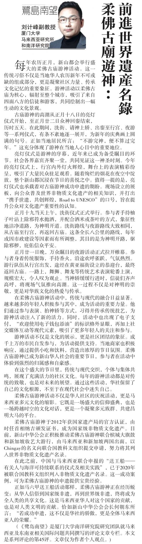 【星洲日报】《鹭岛南望》专栏:刘计峰 | 柔佛古庙游神:前进世界遗产名录