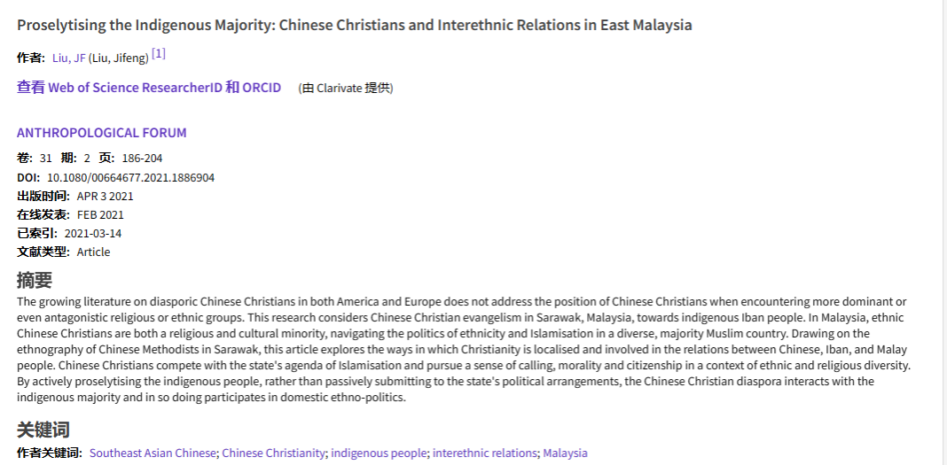 2021年04月,我所刘计峰老师在SSCI刊物Anthropological Forum发表文章Proselytising the Indigenous Majority: Chinese Christians and Interethnic Relations in East Malaysia。文章以马来西亚砂拉越州华人卫理公会为研究对象,探究华人基督徒的跨族群宣教。华人基督徒积极向原住民传播福音,促进族群的基督教化,其背后的驱动力不仅仅是源自宗教本身的宣教使命,更有马来西亚官方主导的伊斯兰化工程带来的焦虑感,他们以此追寻公民政治权益,继而反思宗教使命与作为基督徒的道德。