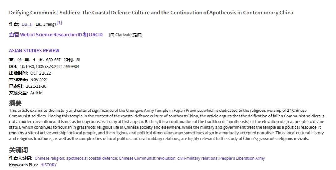 2021年11月,我所刘计峰老师在SSCI刊物Asian Studies Review发表文章Deifying Communist Soldiers: The Coastal Defence Culture and the Continuation of Apotheosis in Contemporary China。