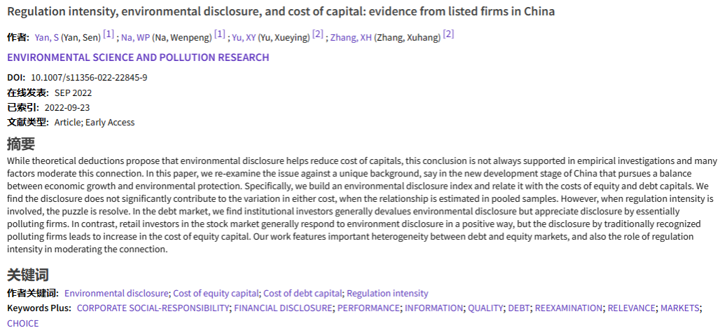2022年9月,闫森老师在SCI刊物Environmental Science and Pollution Research发表文章Regulation intensity, environmental disclosure, and cost of capital: evidence from listed firms in China。文章在中国追求经济增长与环境保护平衡的新发展阶段背景下重新审视“环境披露有助于降低资本成本”这一理论推论,建立环境披露指数并与股权债务资本成本关联,发现债务与股票市场的异质性,以及监管强度在调节联系中的作用。