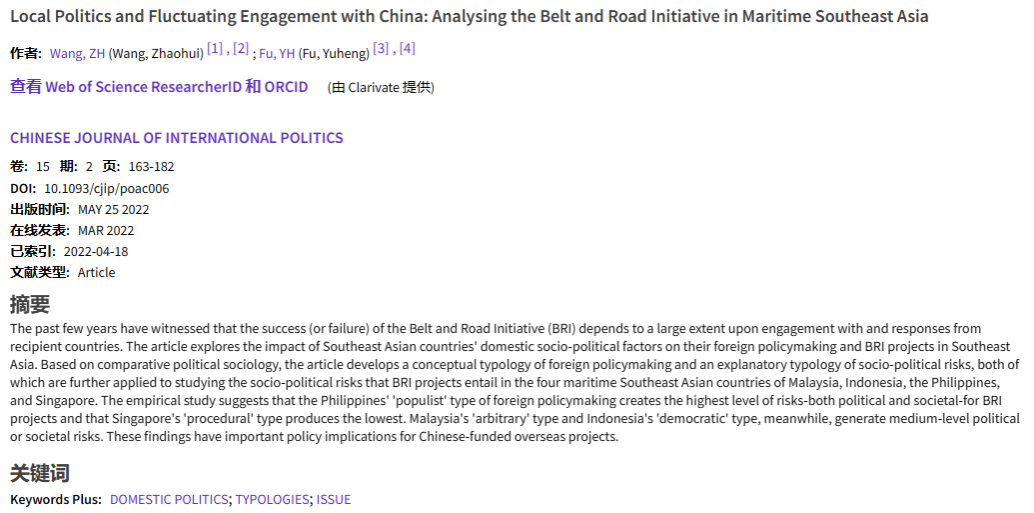 2022年5月,王昭晖老师在SSCI刊物The Chinese Journal of International Politics发表文章Local Politics and Fluctuating Engagement with China: Analysing the Belt and Road Initiative in Maritime Southeast Asia。文章探讨了东南亚国家国内社会政治因素对其在东南亚的外交政策制定和“一带一路”项目的影响,基于比较政治社会学,发展了外交政策制定的概念类型学和社会政治风险的解释性类型学,并进一步应用于研究“一带一路”项目在马来西亚、印度尼西亚、菲律宾和新加坡这四个东南亚海上国家带来的社会政治风险。实证研究表明,菲律宾的“民粹主义”式外交政策制定为“一带一路”项目创造了最高水平的政治和社会风险,而新加坡的“程序”类型产生的风险最低,与此同时,马来西亚的“专横”型和印尼的“民主型”产生了中等层次的政治或社会风险,这些发现对中国资助的海外项目具有重要的政策意义。