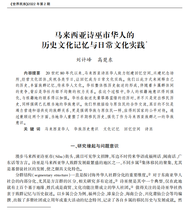 2022年4月,刘计峰老师在CSSCI来源刊物《世界民族》发表文章《马来西亚诗巫市华人的历史文化记忆与日常文化实践》。文章将马来西亚诗巫华社的记忆潮作为研究海外华人社会的一个分析视角,以此理解华人如何通过诠释移民与发展历史来塑造族群认同。 基于对诗巫华社的个案分析,聚焦于当地华人如何将回忆变成日常的实践,来打造属于他们的文化记忆,并在此基础上,进一步探讨文化记忆如何形塑马来西亚华人的族群历史意识。