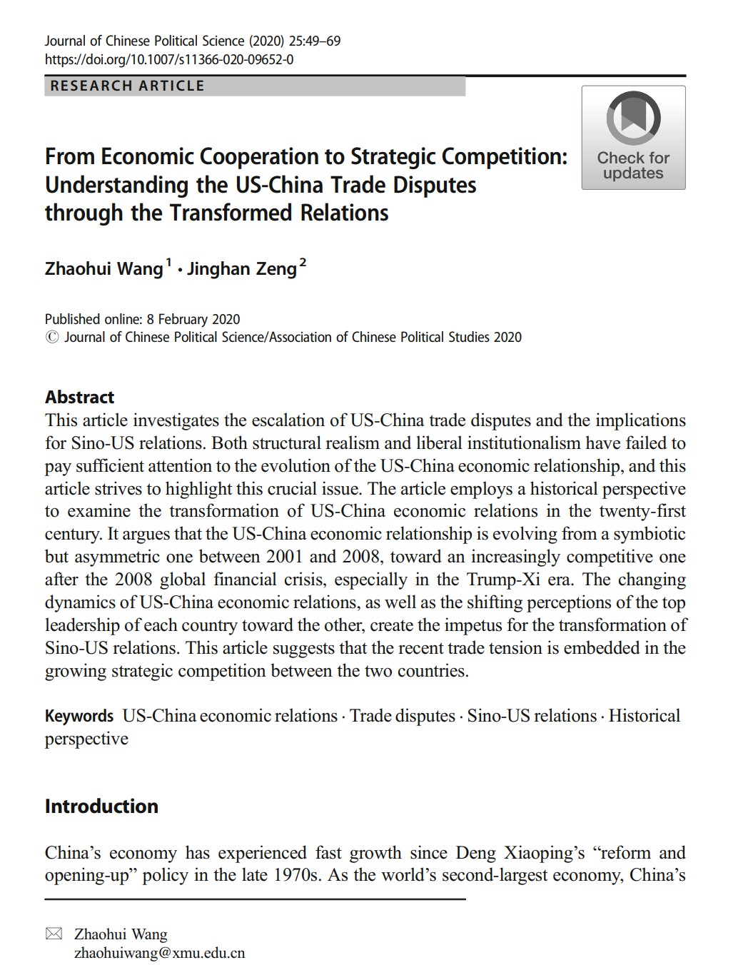 2020年2月,我所王昭晖老师在SSCI期刊《Journal of Chinese Political Science》(35(1), p.49-69)上的论文《From economic cooperation to strategic competition: Understanding the US-China trade disputes》正式发表。