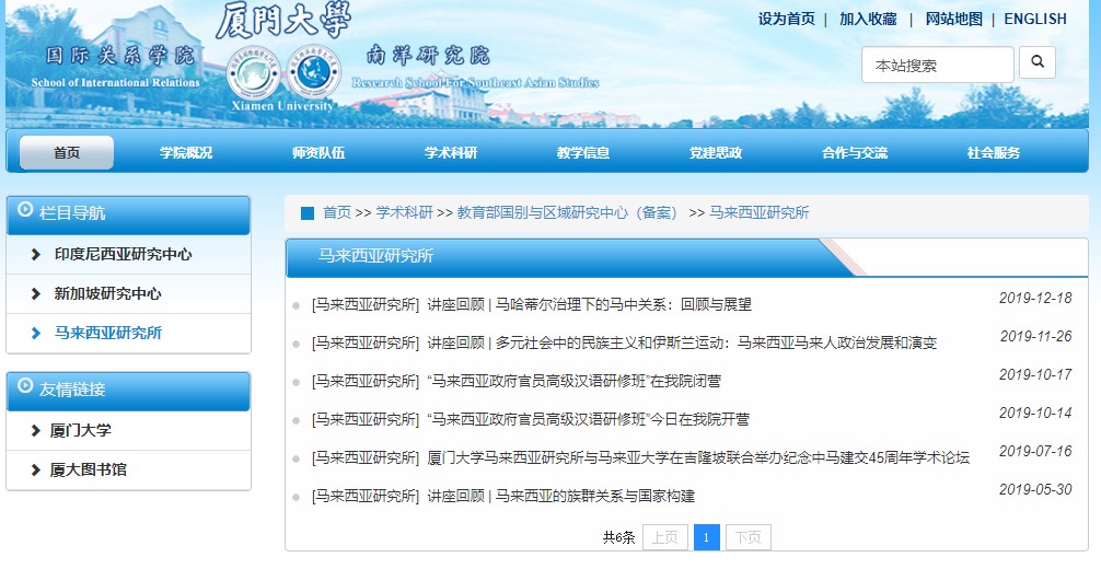 2、2019年,我所在我院及东南亚研究中心网站开设“马来西亚研究所”专栏(如下图),更新相关30条资讯,网址为:https://guoguan.xmu.edu.cn/xsky/jybgbyqyyjzx_ba_1/mlxyyjs.htm。
