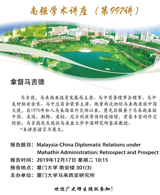 1. 11月25日,由我所主办的“当代马来西亚系列讲座”第四讲邀请马来西亚投资发展局主席、曾任马来西亚驻中国大使拿督马吉德先生为我院师生做一场题为“多马哈蒂尔治理下的马中关系:回顾与展望”的学术讲座,详情参见https://ny.xmu.edu.cn/mlxyyjs.htm