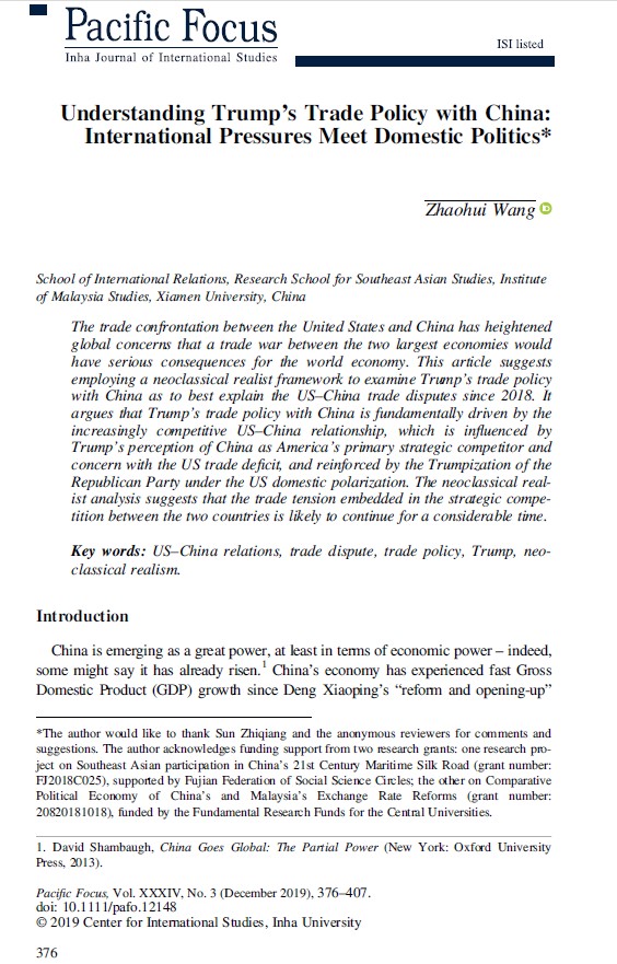 1、我所王昭晖老师在SSCI期刊《Pacific Focus》(《亚太聚焦》)发表题为 《Understanding Trump’s Trade Policy with China: International Pressures Meet Domestic Politics》论文,详情如下: Zhaohui Wang, “Understanding Trump’s Trade Policy with China: International Pressures Meet Domestic Politics”, Pacific Focus, 2019, 34(3), 376-407。