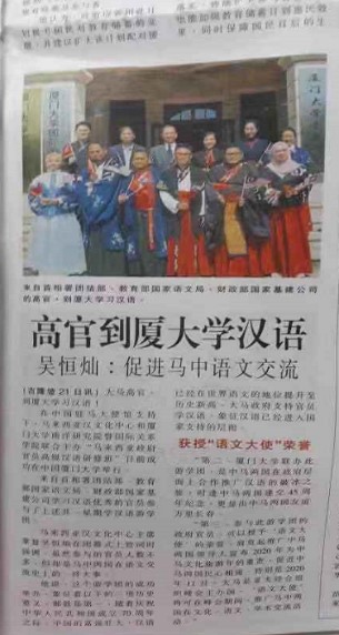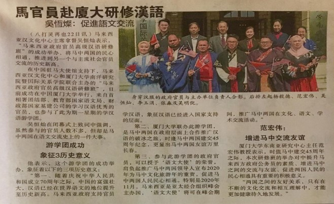 1. 10月13日-18日,我所与马来西亚汉文化中心共同主办“马来西亚政府官员高级汉语研修班”。研修班期间,来自马来西亚首相署、教育部、交通部等部委的高级政府官员共六人在我院进行了为期六天的汉语语言学习及文化交流。研修班详情请参见https://guoguan.xmu.edu.cn/info/1078/3667.htm;https://guoguan.xmu.edu.cn/info/1078/3682.htm,国内外的相关报道参见下图。